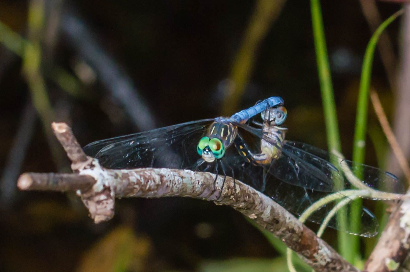 Mating dragonflies, an elephant mosquito and a cooperative Dolomedes triton